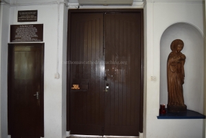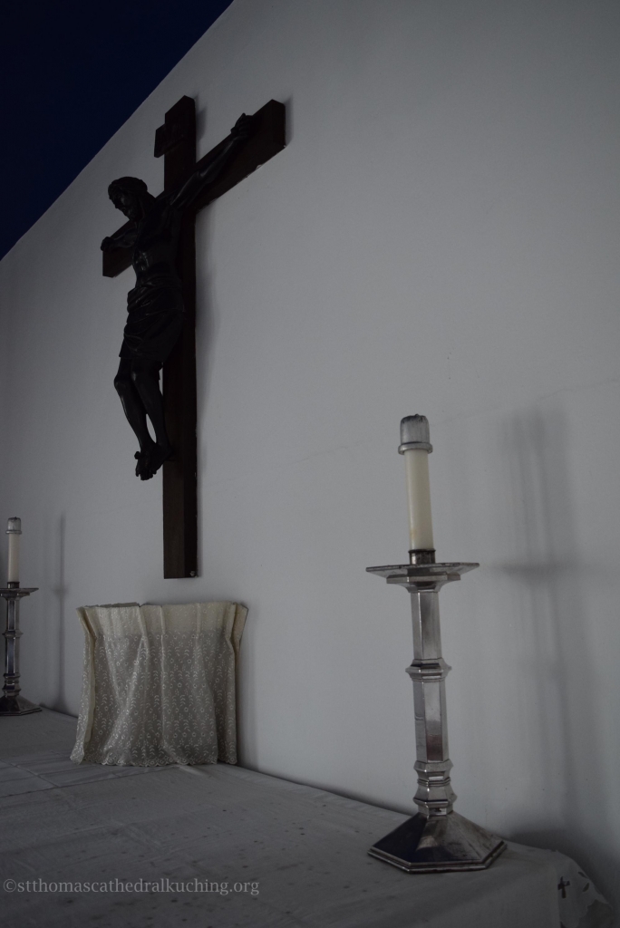 Built into the wall above the centre of the Altar is the Aumbry given by his son in memory of Father Kong Kui En who gave many years of faithful service to the Diocese. The altar cross is represented in the rich chasing of the burnished bronze door of the Aumbry.