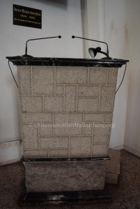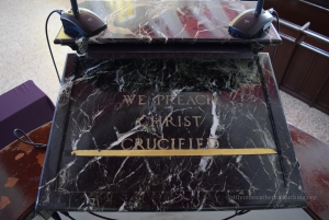 The marble reading desk of it bears the text “We preach Christ Crucified”