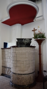 Leaving the Choir Vestry by the same door and turning right, we pass along the front of the Nave. On the right, we see the Stone Reading Desk or Lectern, is the gift of the Church of Good Shepherd, Lutong, Miri. It is made of Hong Kong granite and is lesser brother to the great Stone Drum Pulpit on the opposite side of the Chancel. This latter is the gift of one of the large banks that function within the Diocese.